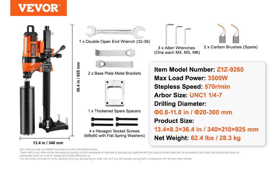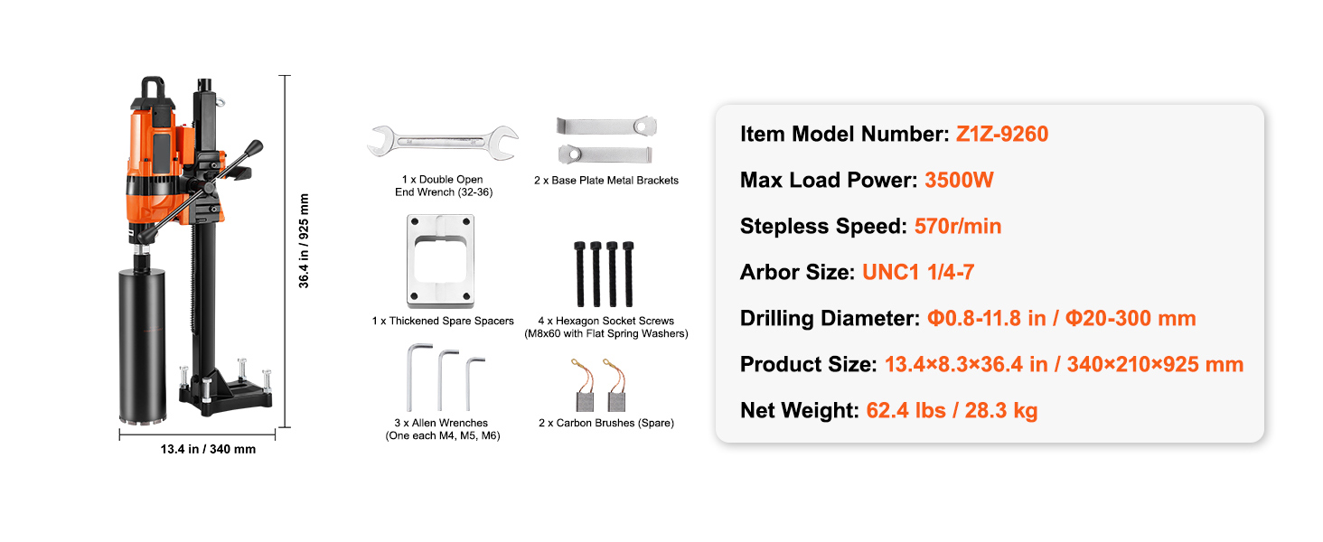 • Professional Accessories Included: The core drilling machine comes with a Φ5 in / Φ127 mm drill bit, allowing quick completion of large-diameter drilling tasks. It includes two carbon brushes and a double-ended wrench for convenient and quick maintenance.