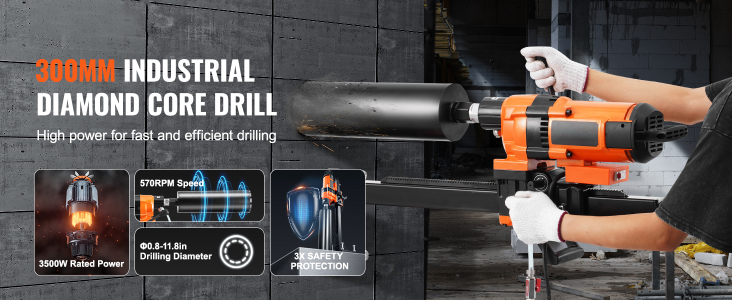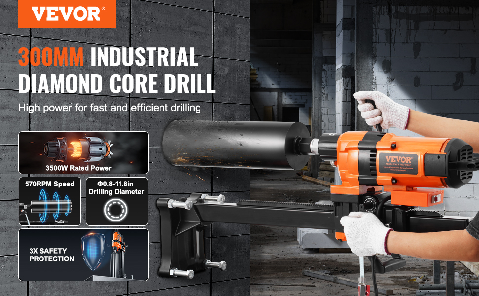 • Powerful Core Drilling Efficiency: Equipped with a 3500W motor, this core drill machine handles hole sizes from Φ0.8-11.8 in / Φ20-300 mm effortlessly. Whether you're drilling large or small holes, it ensures efficient and precise results every time.