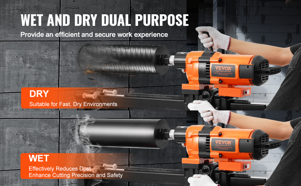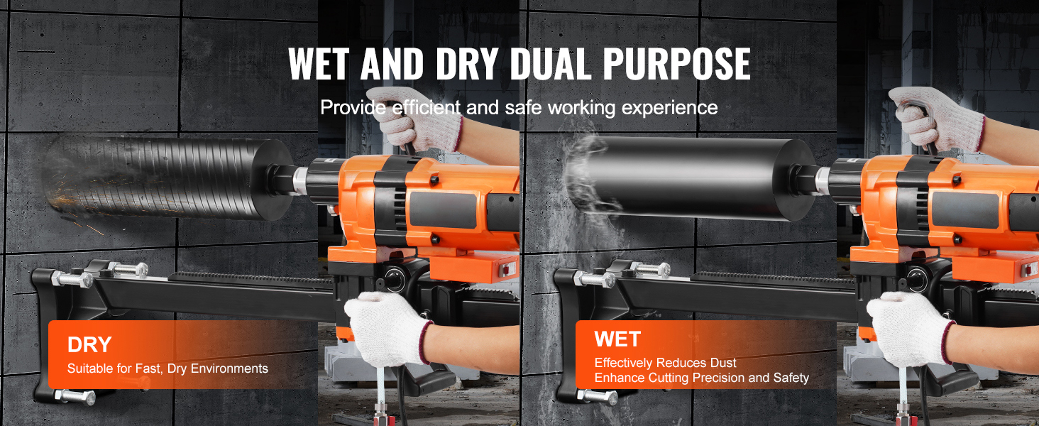 Experience superior cutting and debris removal speed with the dry cutting mode. The wet cutting mode reduces dust and overheating during operation, improving safety and comfort in the work environment. It also helps reduce tool wear, extending the core drilling machine's lifespan.