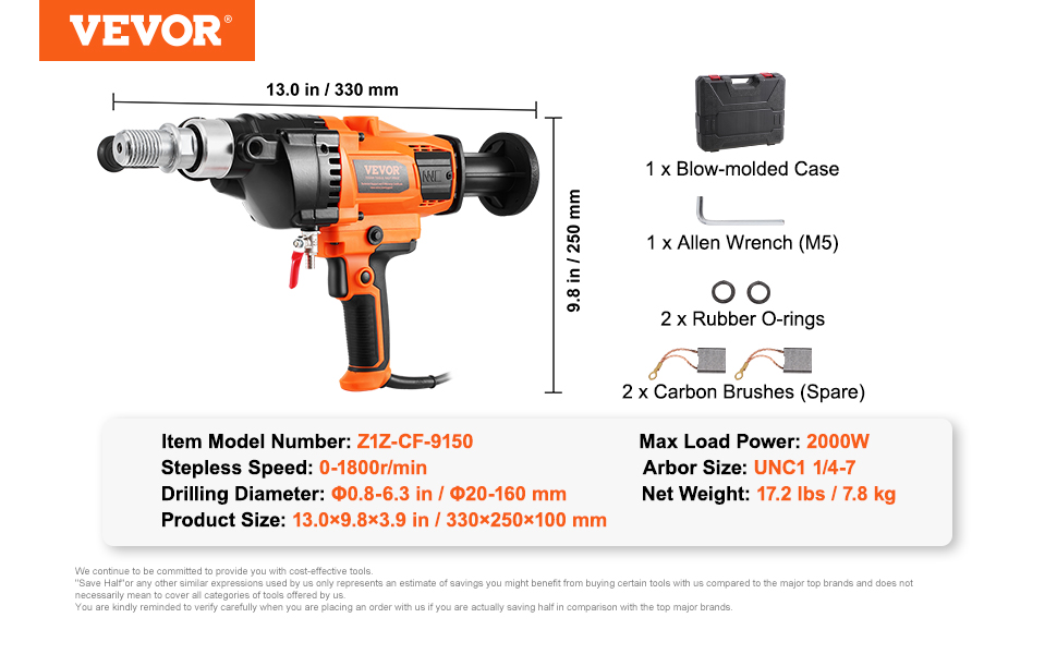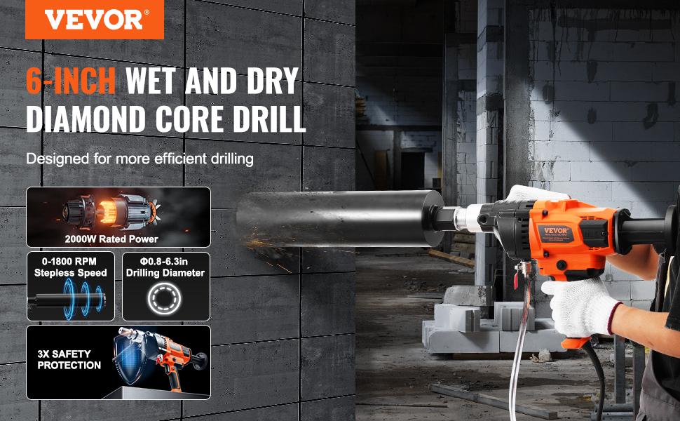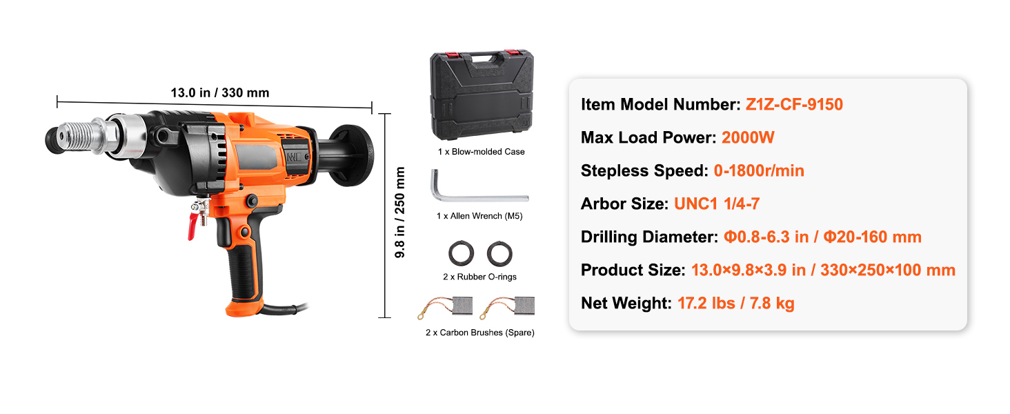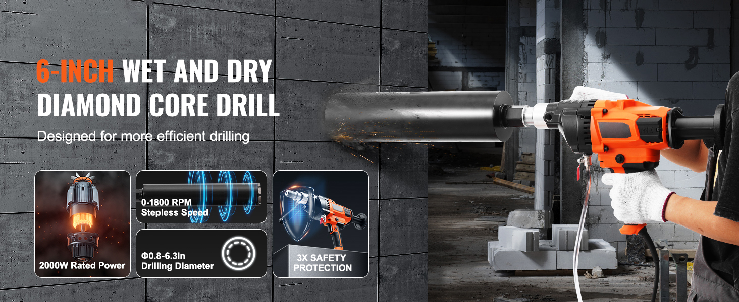 • Powerful Core Drilling Efficiency: Equipped with a 2000W motor and adjustable speed, this core drill rig can handle hole sizes ranging from Φ0.8-6.3 in / Φ20-160 mm effortlessly. Whether drilling large or small holes, this tool ensures every task is efficient and precise.