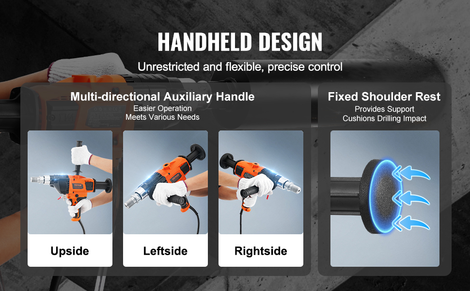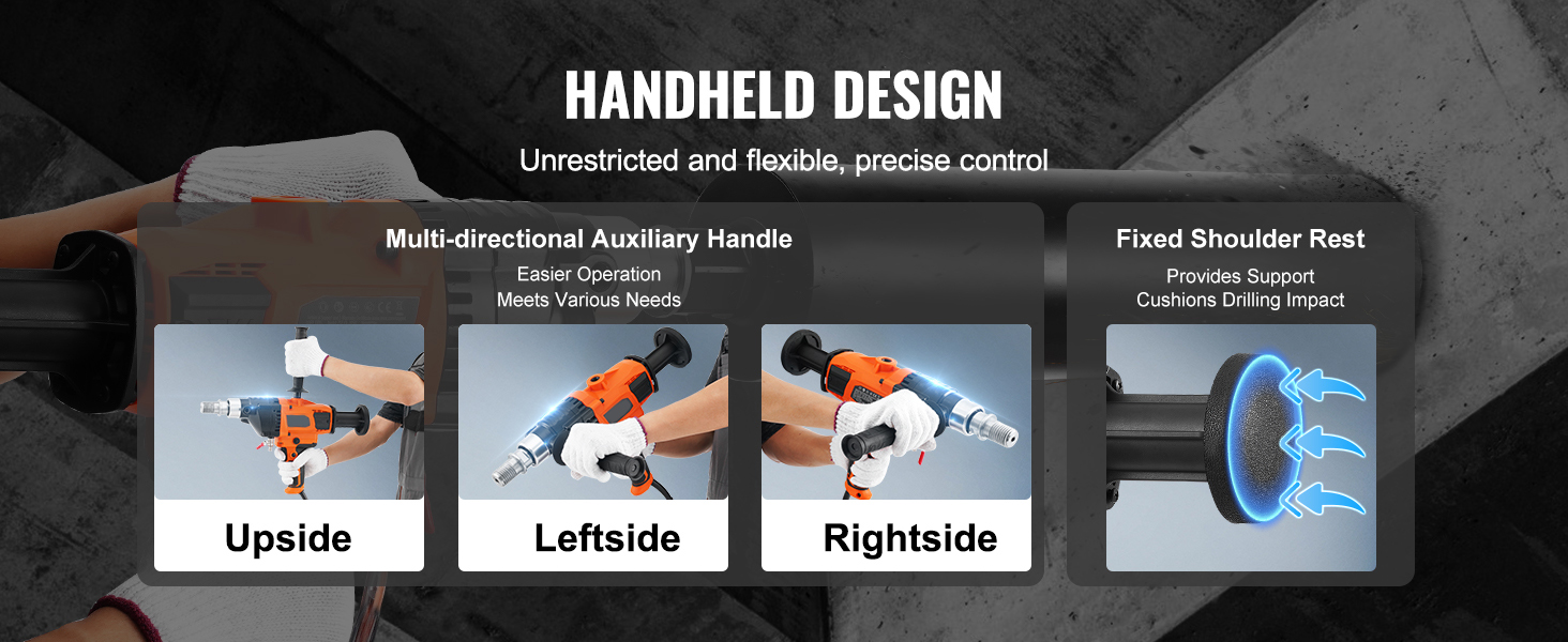 • Handheld Design for Maximum Control: The core drilling machine features optimized weight distribution and structural design, allowing easy handling in various construction environments. Whether working in tight spaces or at elevated heights, you can easily adjust the drilling angle and depth for perfect results every time.