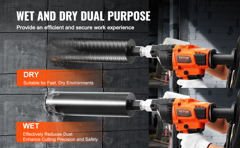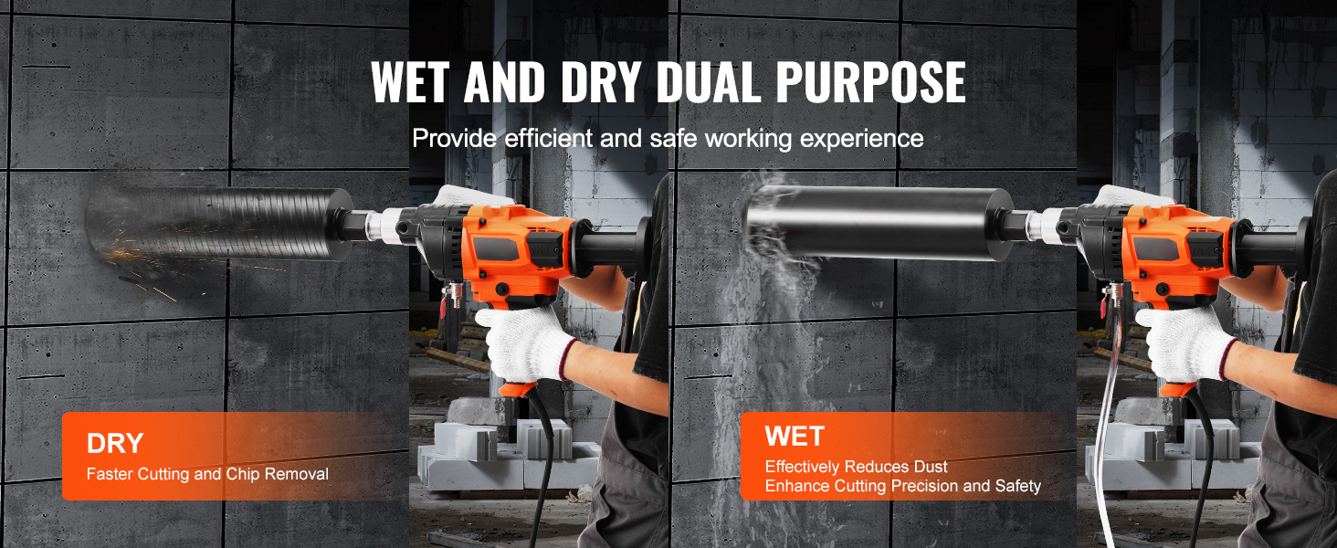 • Wet & Dry Cutting Capabilities: Our concrete core drill supports both dry and wet cutting modes. Dry cutting is ideal for fast drilling in dry environments or high-efficiency scenarios, while wet cutting reduces dust and heat, providing enhanced safety and comfort during operation.
