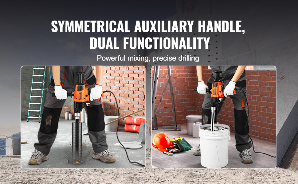 • Versatile Multi-Function Use: Whether you need precise drilling or mixing cement, paint, or glue, this core drill machine handles it all with ease. The symmetrical auxiliary handle ensures comfort and stability, even during extended use. Quickly switch between different modes to meet a variety of construction needs.