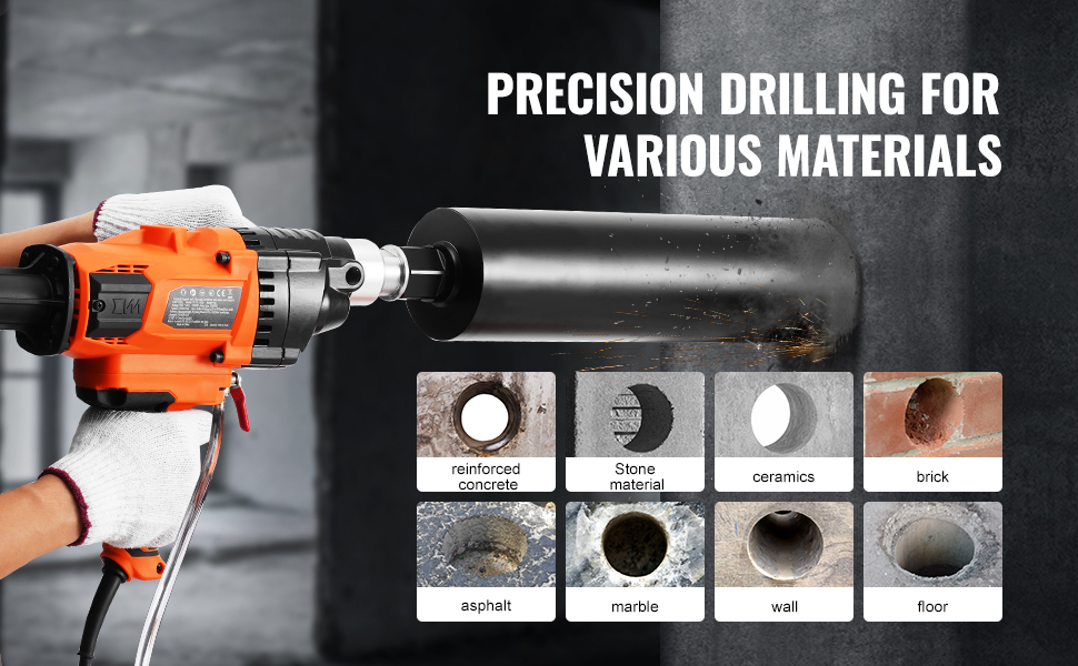 • Engineered for Precision Drilling: The coring drill is designed for easy operation when drilling through reinforced concrete, red brick, marble, and more. It meets professional standards and is versatile enough for various tasks like installing air conditioners, kitchen pipes, stair railings, and even highway maintenance.
