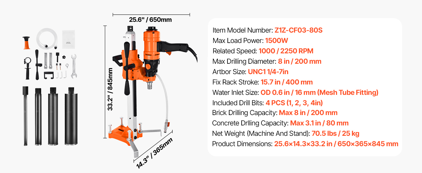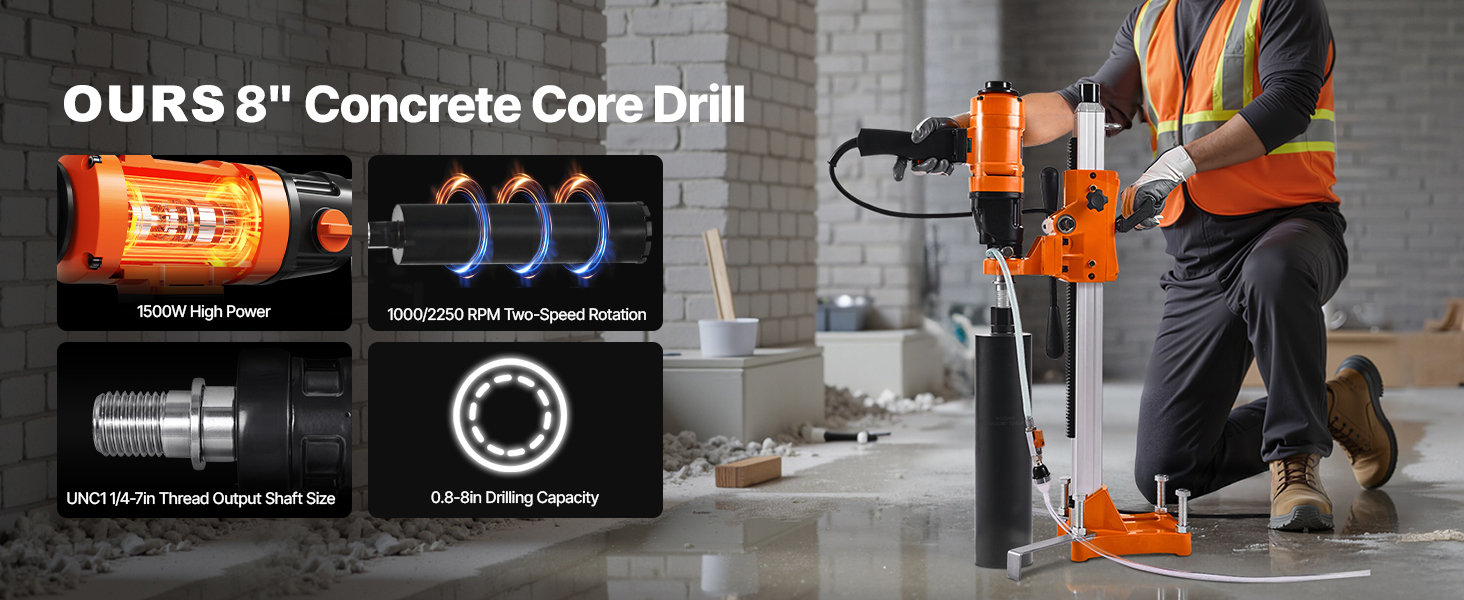 • Efficient and High-Performance Drilling: Equipped with a strong 1800W motor and dual-speed options (1075 RPM and 2300 RPM), this core drill ensures quick and effective drilling. It supports hole sizes up to 8 inches (200 mm) with a 1/4-7 inch threaded output shaft, making it suitable for demanding applications.