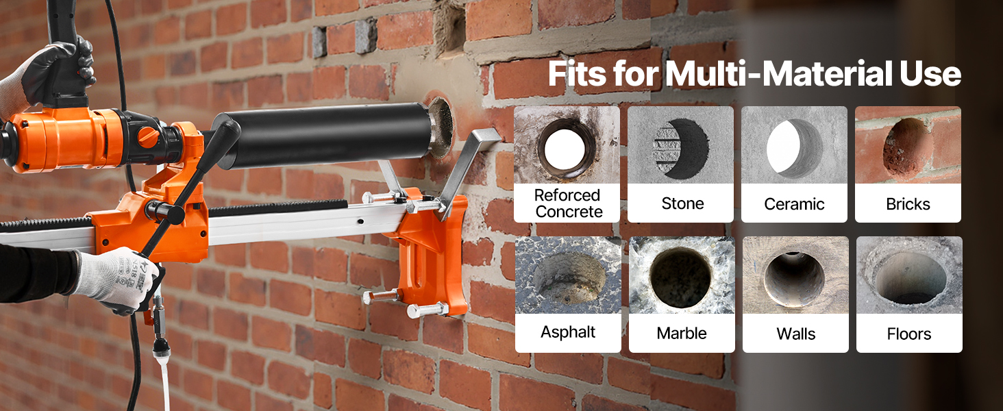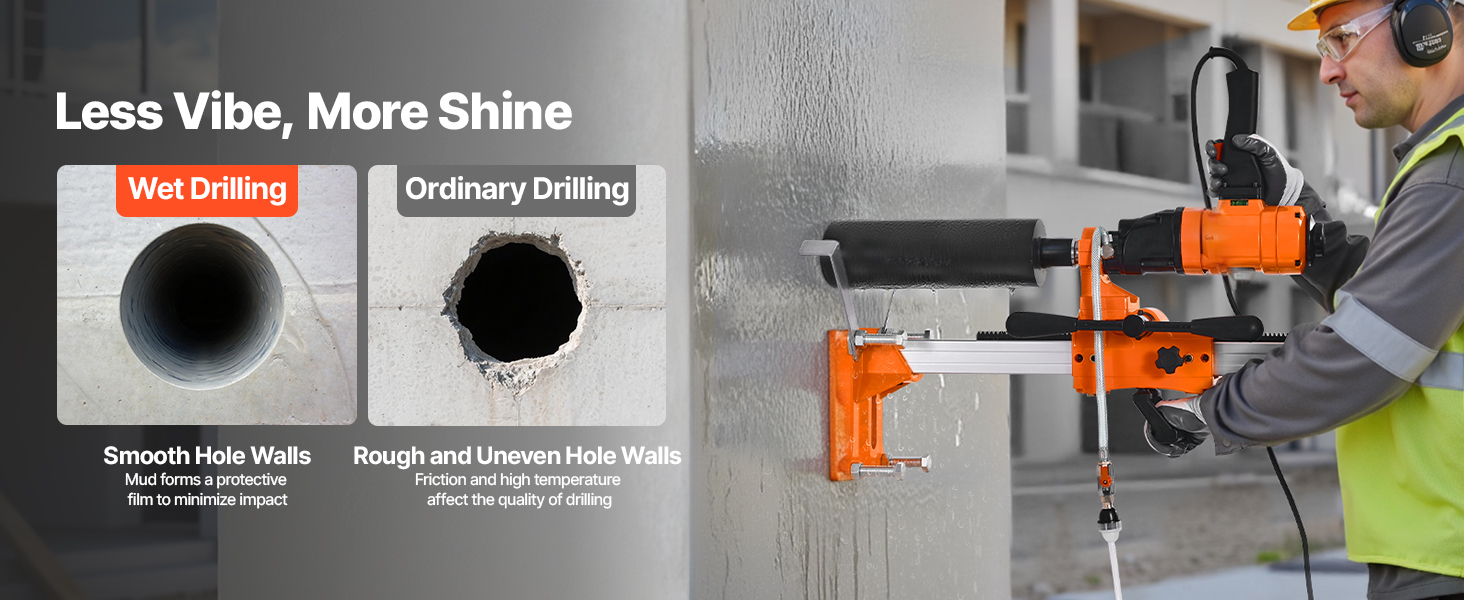 • Enhanced Drilling Performance: This diamond core drilling machine supports both wet and dry drilling methods. The wet drilling function helps to clear debris and cool the drill bit using water, minimizing dust and ensuring smoother hole finishes—ideal for indoor remodeling projects.