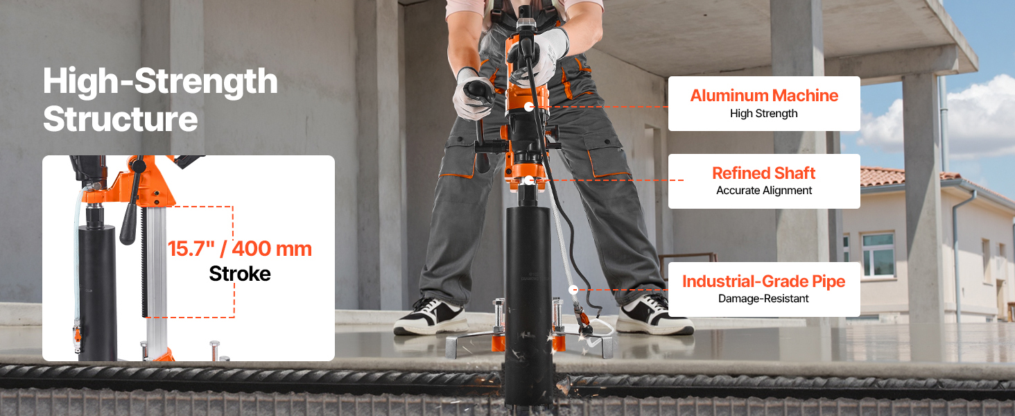 • Durable Construction: Designed with a sturdy yet lightweight aluminum frame, this core drill rig offers excellent resistance to wear while minimizing user fatigue. Its reinforced PVC water hose ensures durability against cracking, and the steel output shaft provides reliable precision.