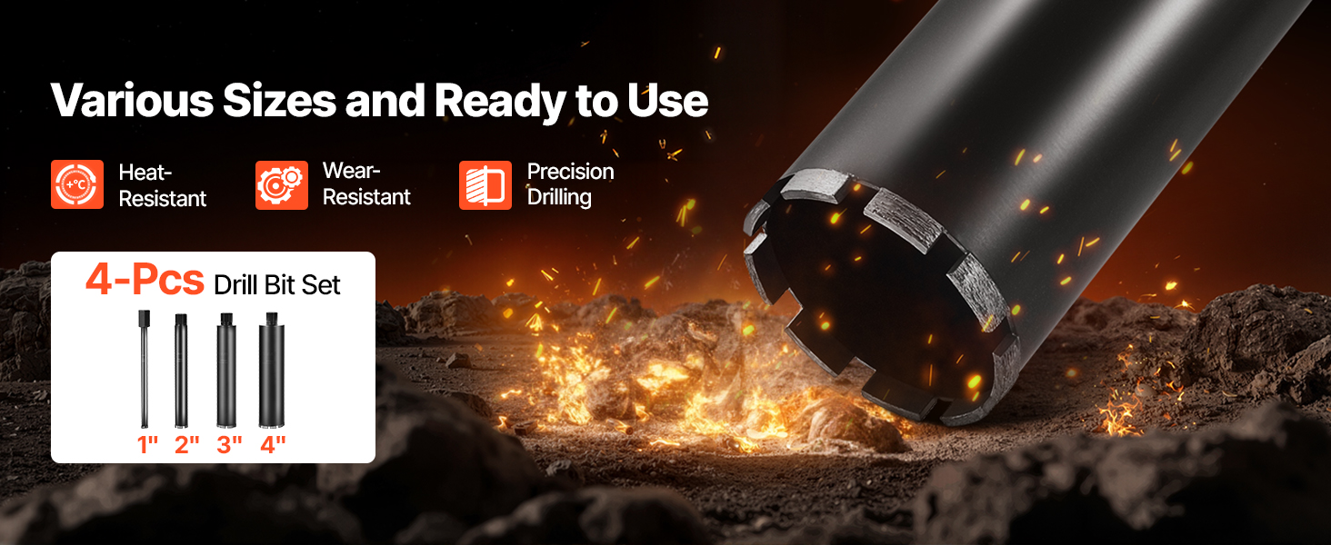 • Comprehensive Set: This concrete core drilling kit is equipped with four high-quality drill bits (1 inch, 2 inches, 3 inches, 4 inches), designed to handle materials like reinforced concrete, brick, marble, and more. Perfect for a variety of drilling applications.
