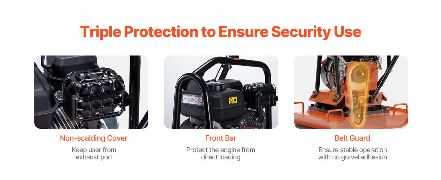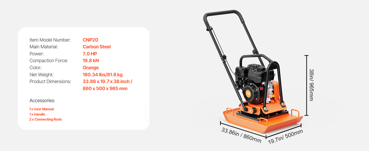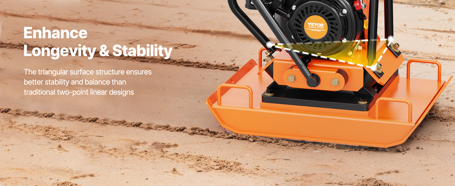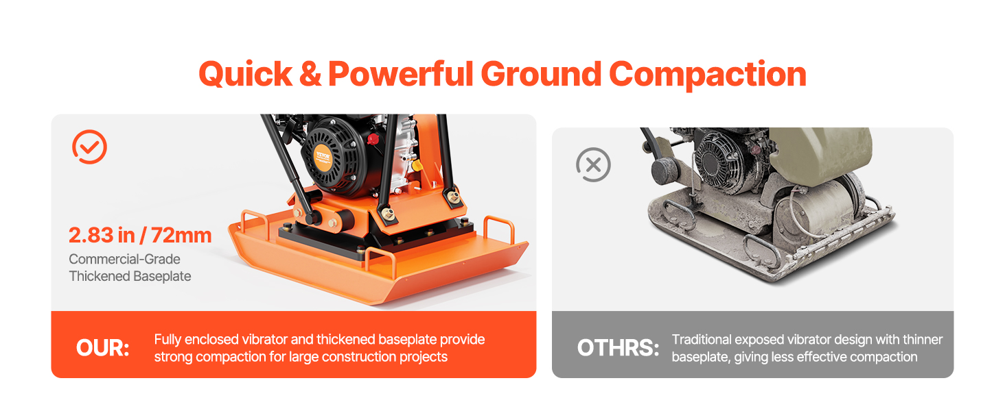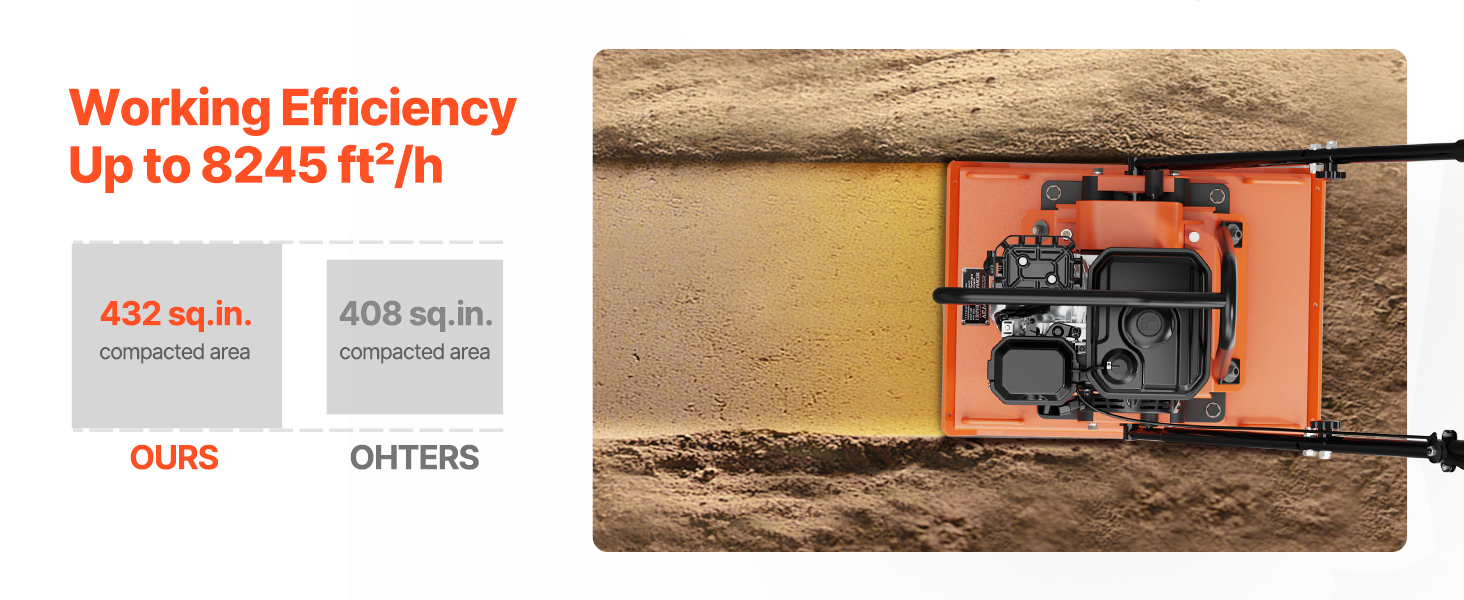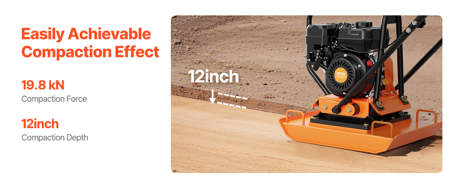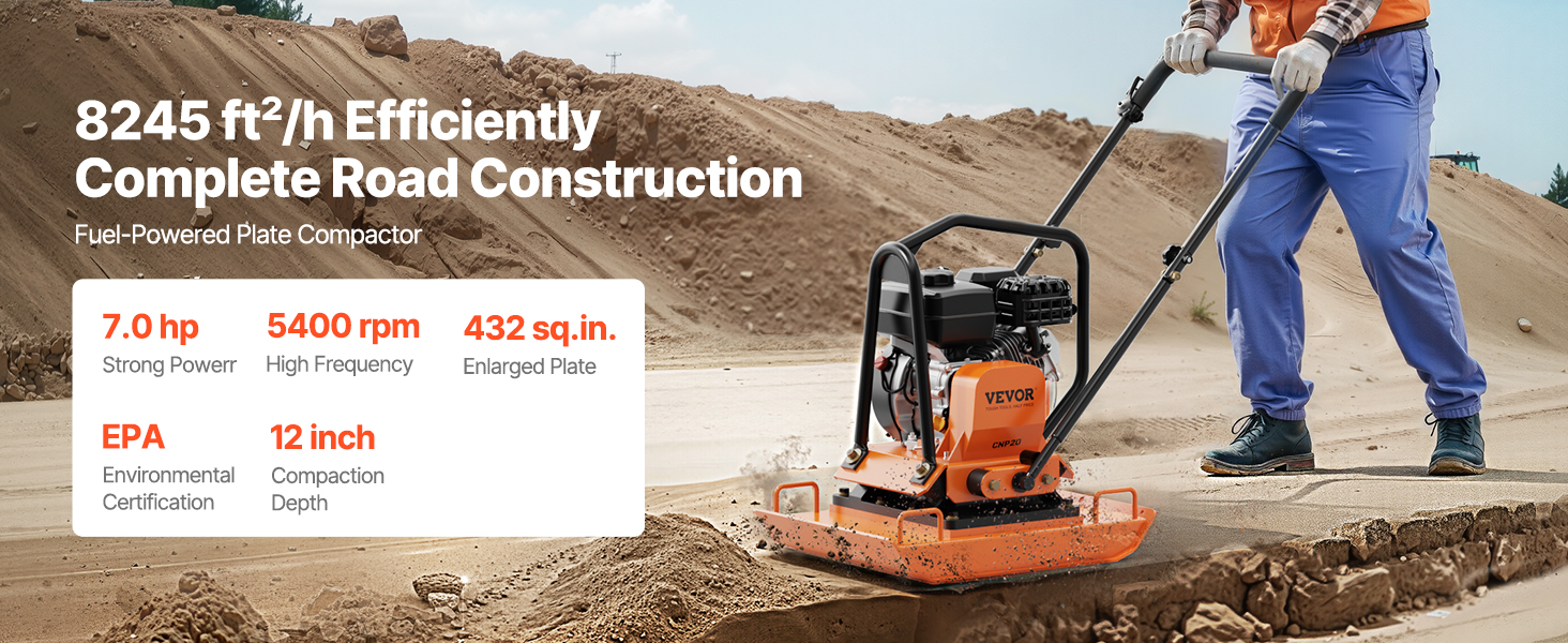 • Durable Construction: This professional compactor's excellent engine can reach a speed of 5400 RPM, helping you compact the ground quickly. The 2.83 in thick compaction plate can last for a long time without fear of damage. Our compactor is EPA-certified (Certificate Number: RCGPS.1961GR-011), ensuring low gas emissions for a cleaner and healthier atmosphere.