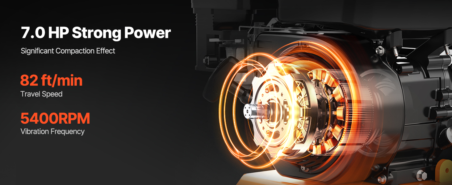 • Mighty Power: This compactor machine's 7.0 HP horsepower can compact 8245 ft² of ground in 1 hour, and 19.8 kN compaction force combined with 82 ft/min travel speed can efficiently complete work tasks.