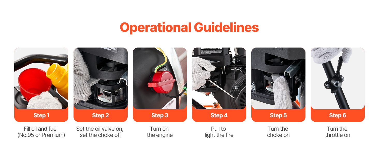 • Large Capacity Fuel Tank: This gas powered compactor is equipped with 0.5 L oil and 2.5 L fuel capacity and is compatible with 95 octane gasoline. After receiving the compactor, you can refuel the tank and start to use it. We recommend that the machine work continuously for a maximum of about 40 min to safeguard the engine.
